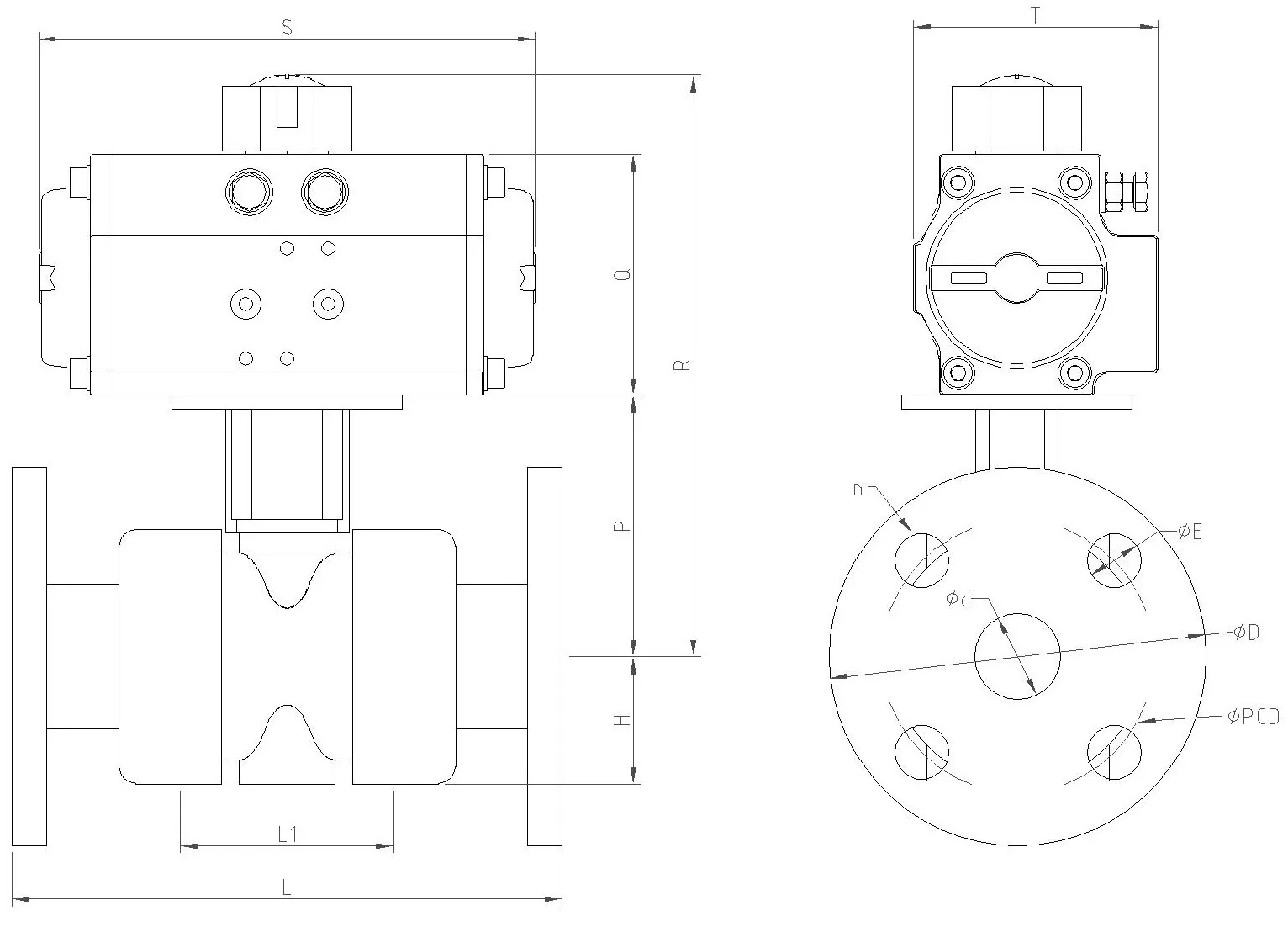 | Model | Size | Actuator | ⌀d | ⌀PCD | ⌀D | L | L1 | H | n | ⌀E | Q | S | T | P | R |