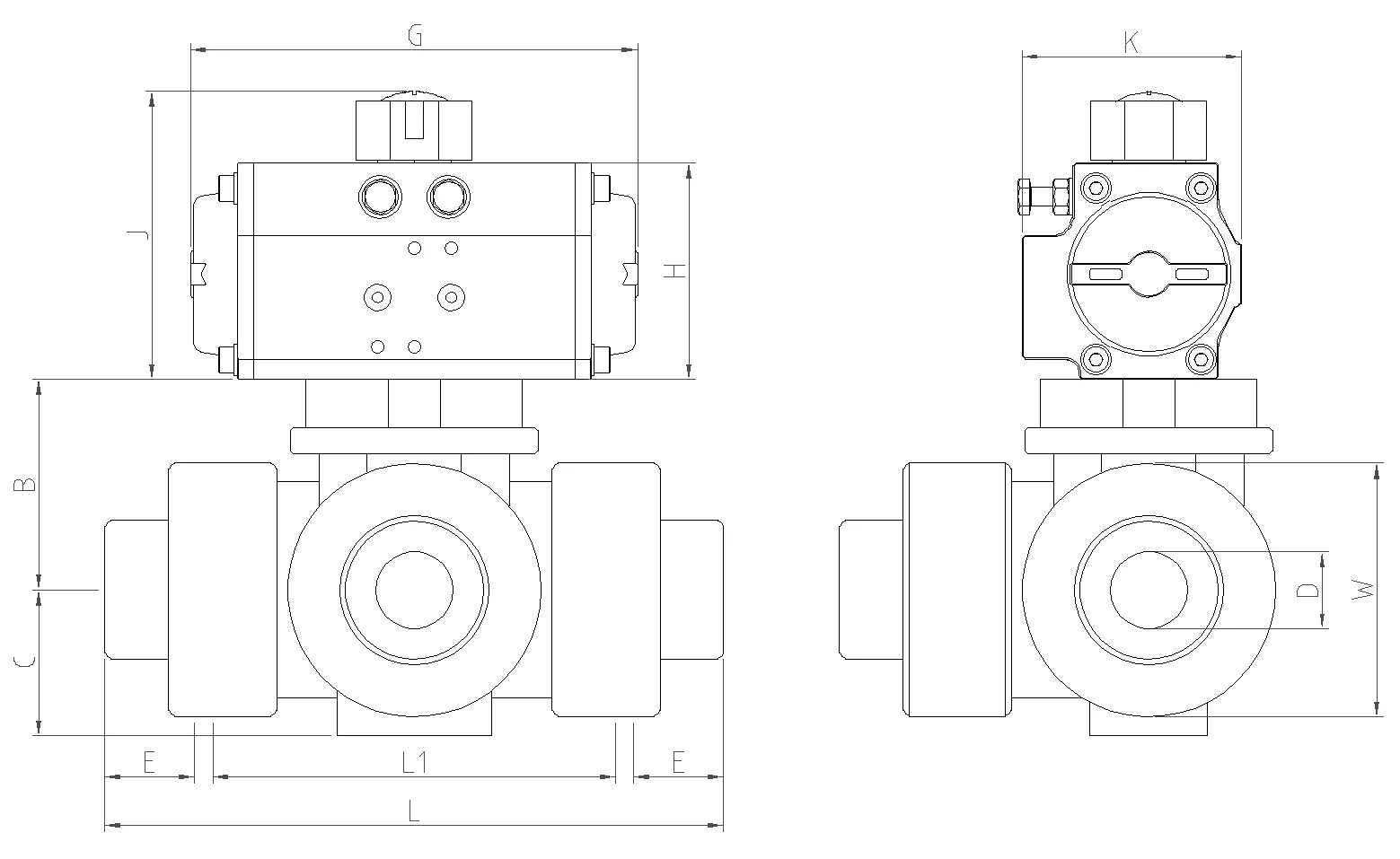 3 way UV stabilised Double Acting Pneumatic PVC true union ball valve available in both L port and T port configurations. Comes with PTFE (Teflon) seats and our unique double stem seal system (standard in EPDM but also available in Viton). Also features a chem lock insert In the end so the true union can be removed for service work and the ball will not leak when in the closed position. Great PVC ball valve for corrosive or chemical media where traditional material such as brass and stainless steel are not suitable. Commonly used in the aquaculture industry (sea water), chemical dosing, water treatment and pool filtration. Choose between Solvent Weld (ANSI Standard designed to fit Schedule 40 & 80 pipe) and BSP threaded ends (Threads conform to ISO 7.1 Sealing Threads.).